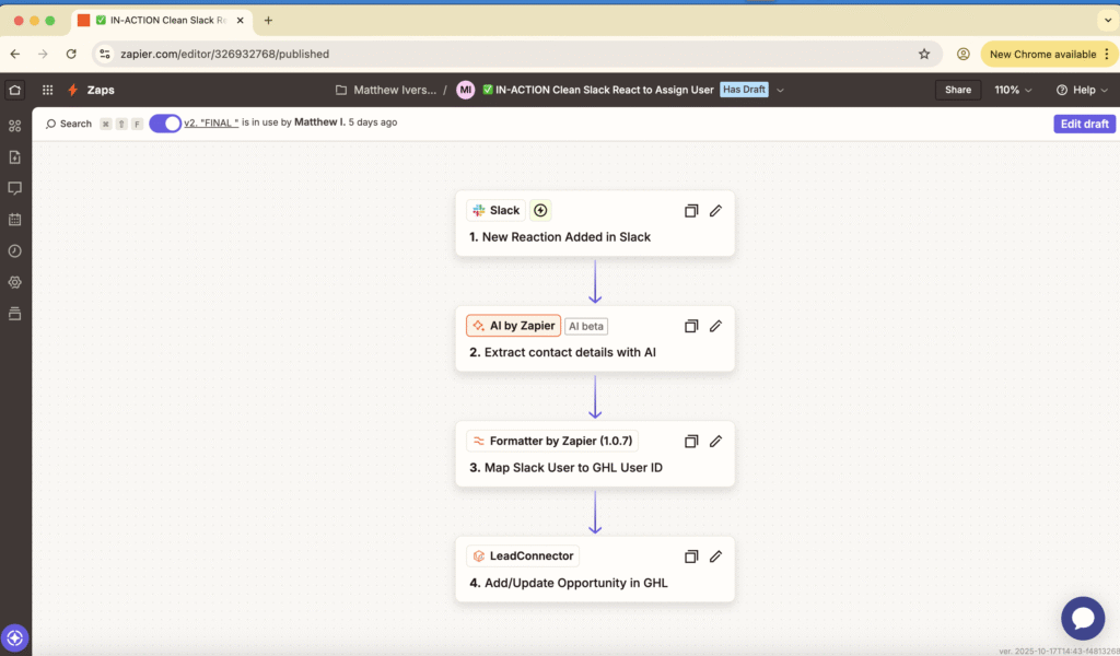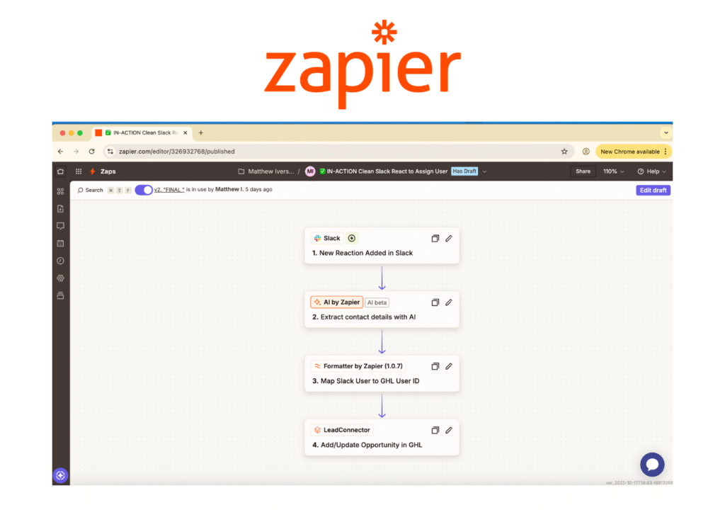 I built a Zapier automation that connects Slack reactions to GoHighLevel via LeadConnector.